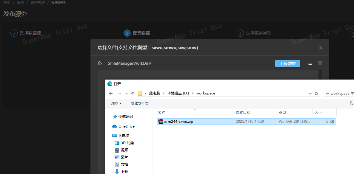 点击“上传数据”,上传待发布的工作空间zip包,在列表中选择对应的.sxwu文件。